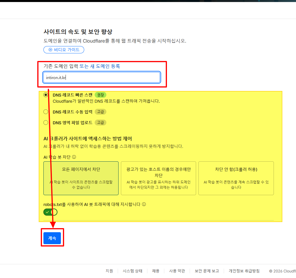 HostingKR 에서 구매한 내 도메인 "intiron.it.kr"을 입력 후 계속 클릭(노란 부분은 원하면 수정해도 문제 없지만 난 기본 설정으로)