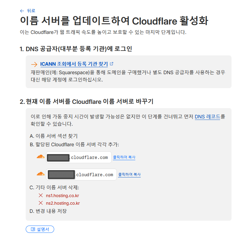 이제 내 도메인을 HostingKR네임서버가 아닌 Cloudflare로 변경을 해야 한다.