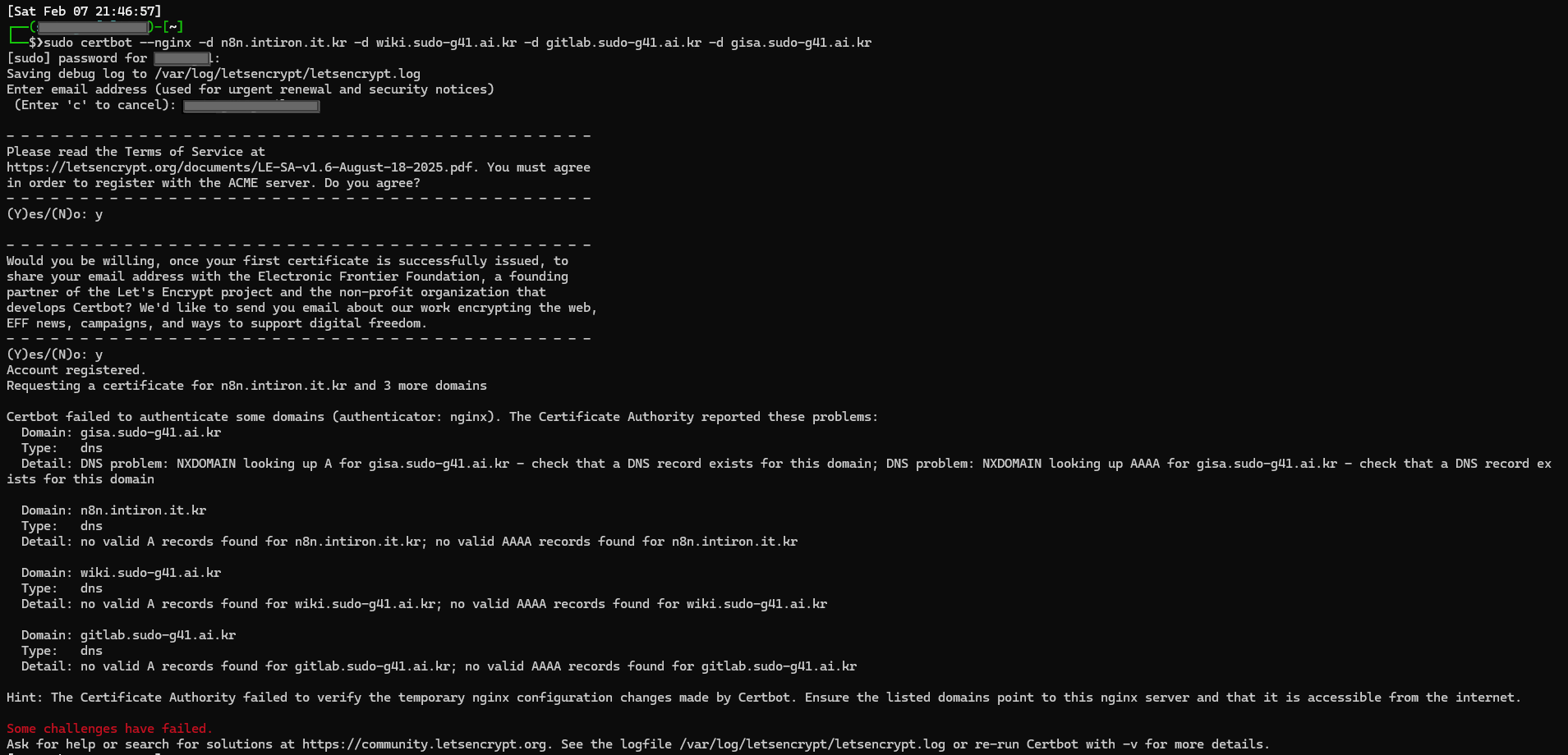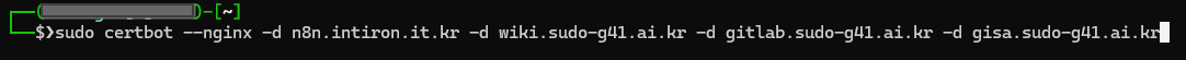 $ sudo certbot --nginx -d n8n.intiron.it.kr -d wiki.sudo-g41.ai.kr -d gitlab.sudo-g41.ai.kr -d gisa.sudo-g41.ai.kr시도를 했지만....