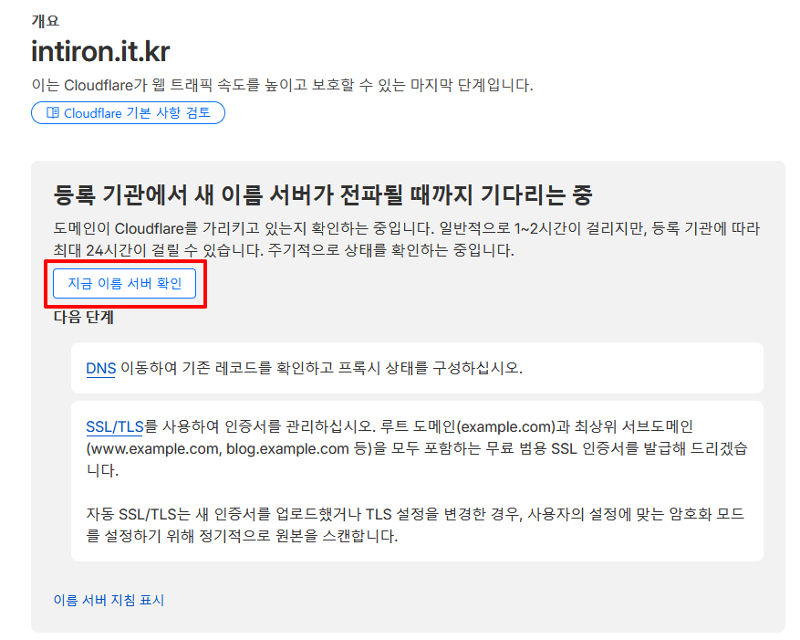 HostingKR에 NS등록 후 Cloudflare로 돌아와서 "내 이름 서버를 업데이트함" 클릭을 하면 완료된다.