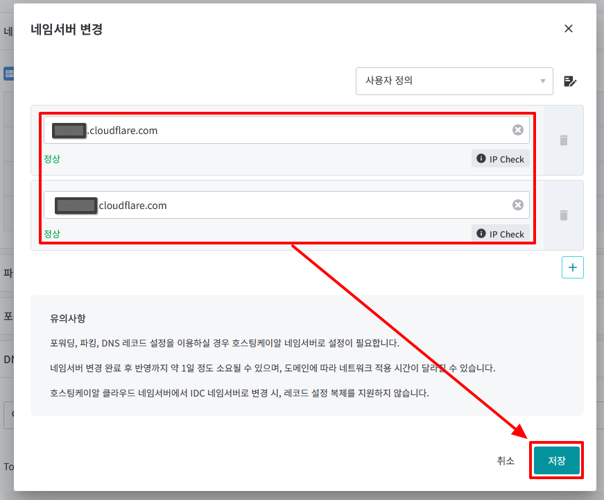Cloudflare에서 준 네임서버 주소를 HostinKR에 접속하여 내 도메인관리창에서 네임서버를 변경한다.