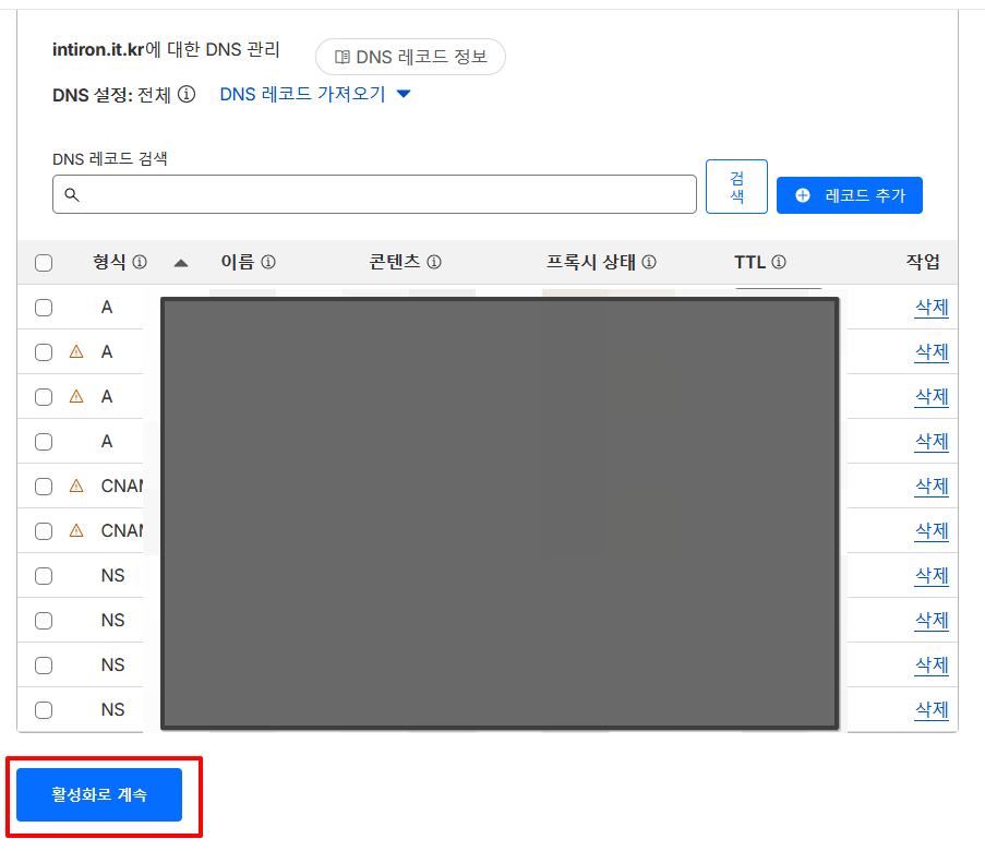 선택 후 다음화면으로 와보니 HostingKR에 등록해둔 레코드가 나온다. 일단 그대로 사용할 예정이니 그대로 두고 활성화로 계속클릭(여기서 추가 레코드 등록이 필요하면 등록하면 된다)