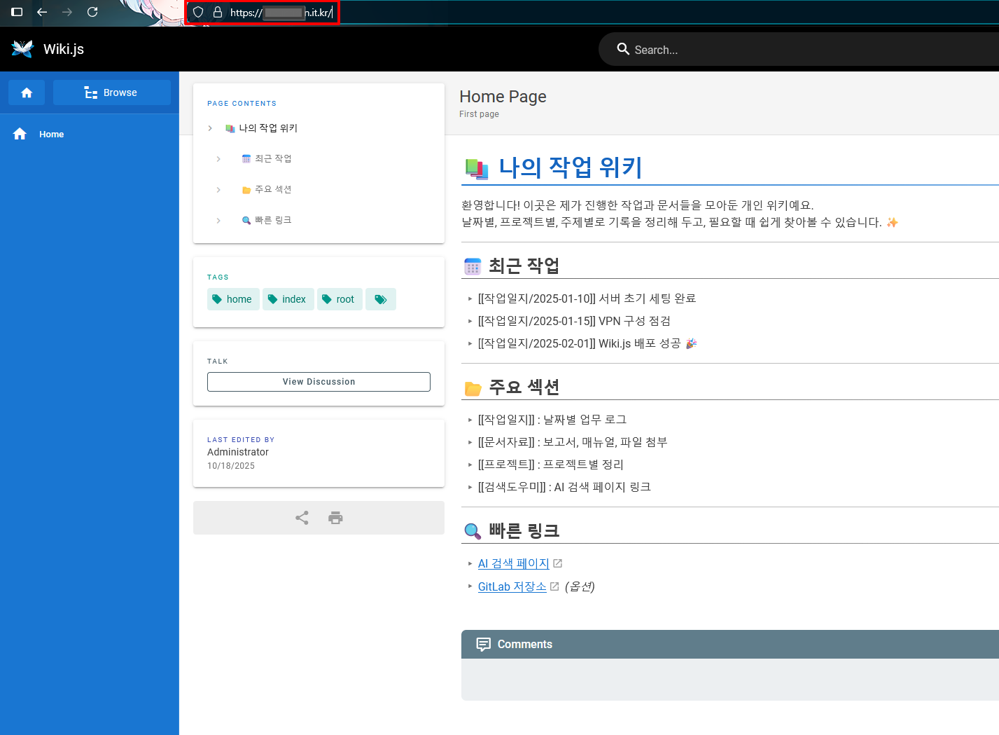 wiki.js로 띄운 위키에 도메인을 입력하여 접속 결과 인증서가 잘 적용 되는 것을 볼 수 있다.
