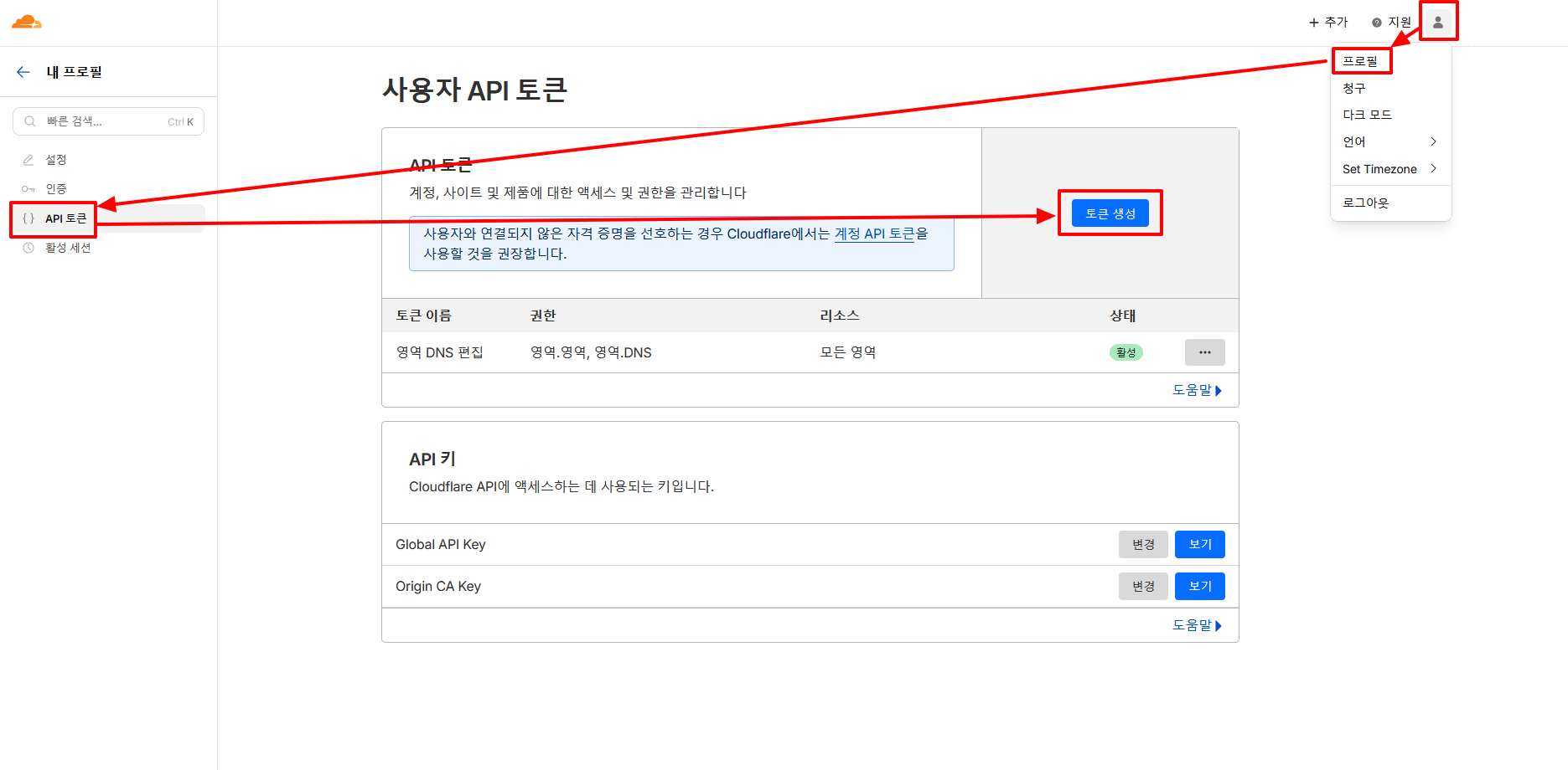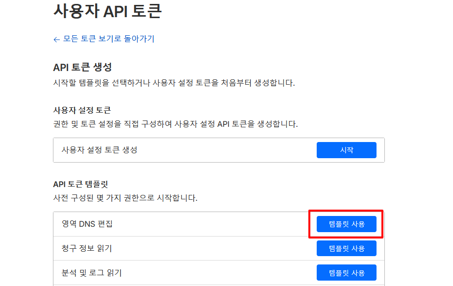 최소 권한을 위하여 Global API Key를 쓰지 않고Cloudflare 대시보드에서 프로필 > API 토큰 > 토큰 생성 클릭