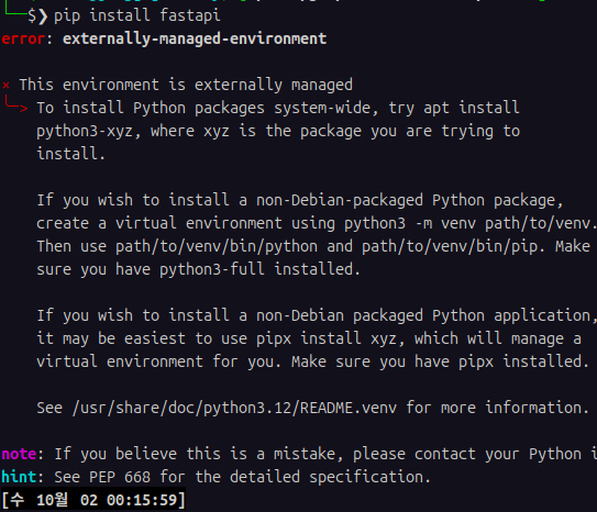 기본이 되는 pip가 error: externally-managed-environment오류가 발생하니 가상환경의 pip가 제대로 돌아가지 않고 있던 상황이었다.