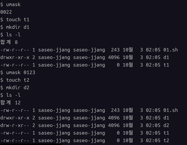 작동방식은 파일(폴더)의 기본값인 0666(0777)에서 umask값을 빼면 된다.