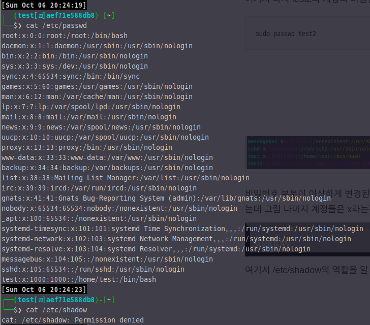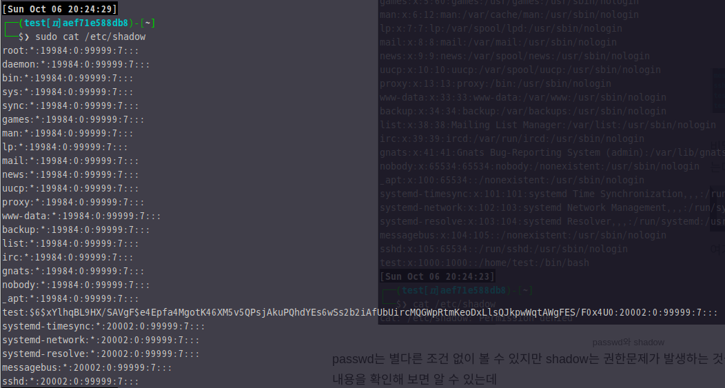 passwd는 별다른 조건 없이 볼 수 있지만 shadow는 권한문제가 발생하는 것을 볼 수 있다.