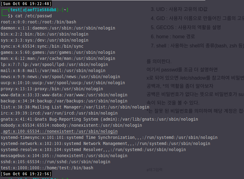 기본적으로 세팅된 docker에서 /etc/passwd를 확인했을 때 이렇게 되어 있다. 여기서